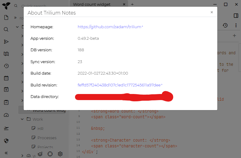 查找Trilium使用哪个数据目录的简单方法是查看”About Trilium Notes”对话框(位于左上角的”Menu”中):