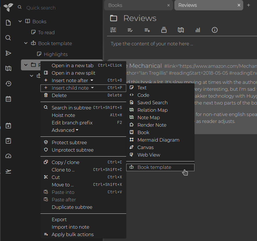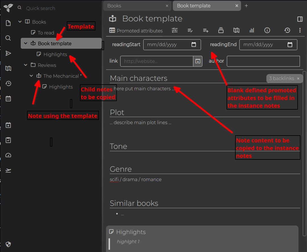 然后我们有实例笔记 - 此笔记与“Book”模板笔记相关,这将导致模板笔记文本用于初始化实例笔记文本,并且模板笔记中的所有属性都继承到实例笔记。