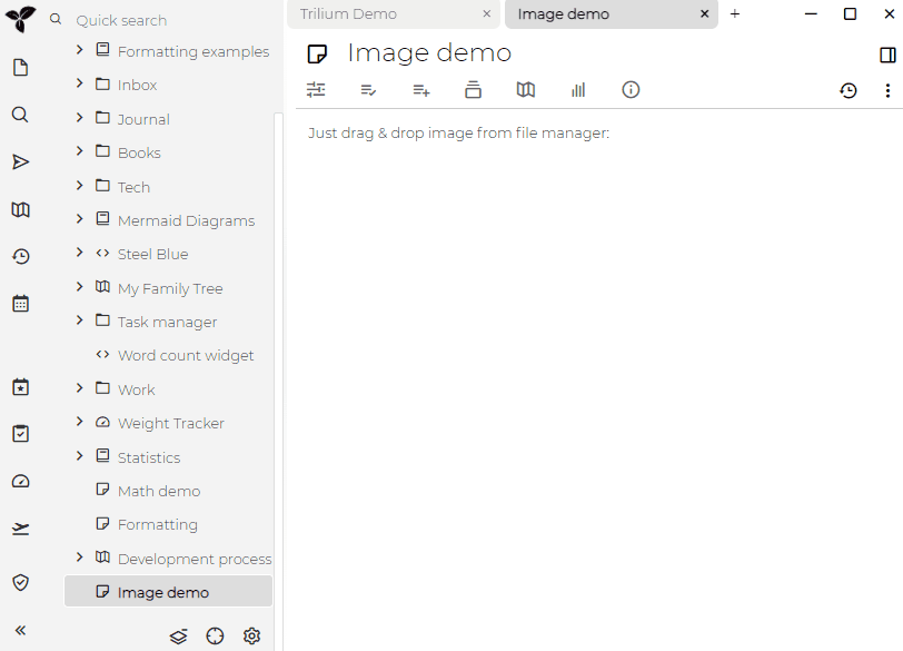 要将图像添加到笔记中,只需将其从文件资源管理器拖到 Trilium 内的笔记编辑器中,图像就会被上传。